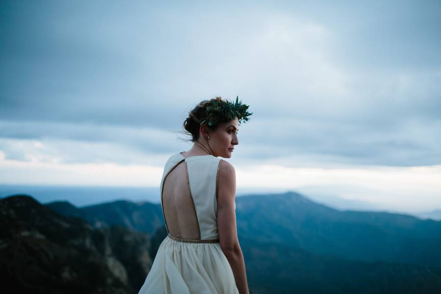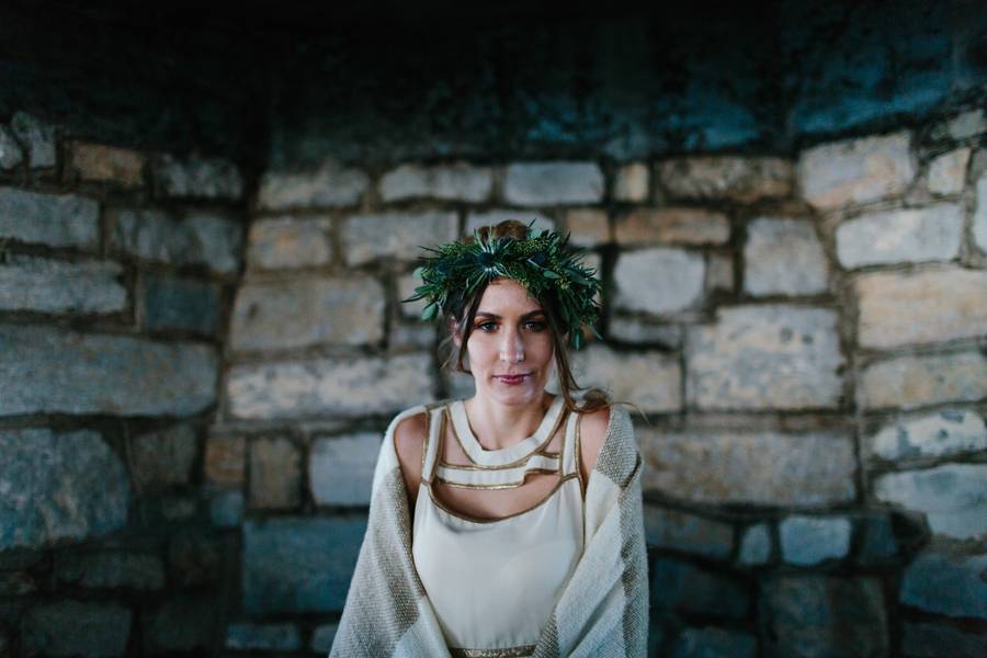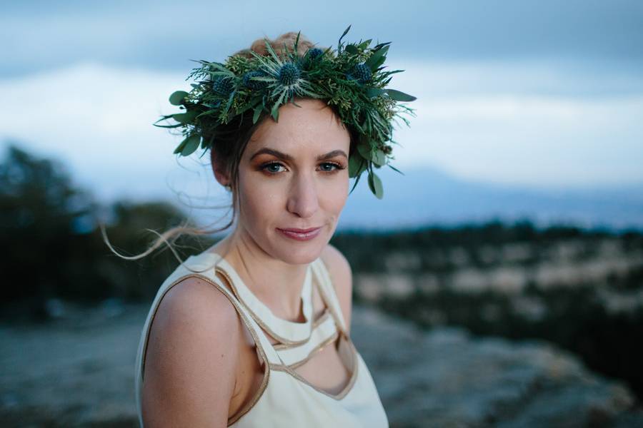 The floral crown features Blue Eryngium Thistle on a bed woven of seeded Eucalyptus and Wild Harvested Juniper. Hand-tied floral bouquet brings together New Mexican Juniper and Rainbow Chard from Sol Harvest Farm. Bouquet showcases Peonies and Anemones.