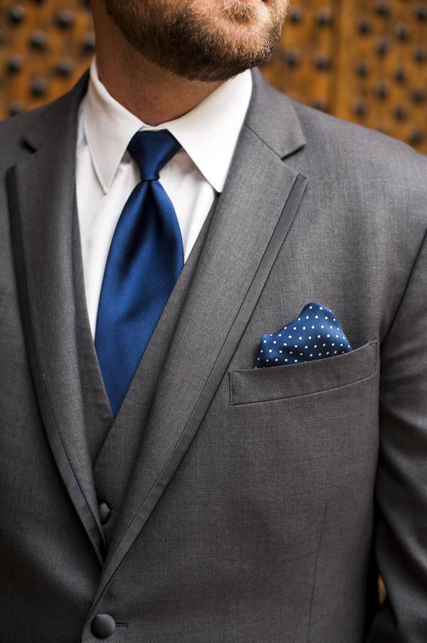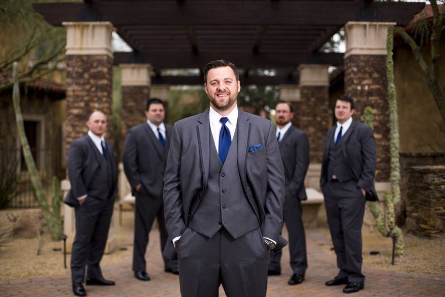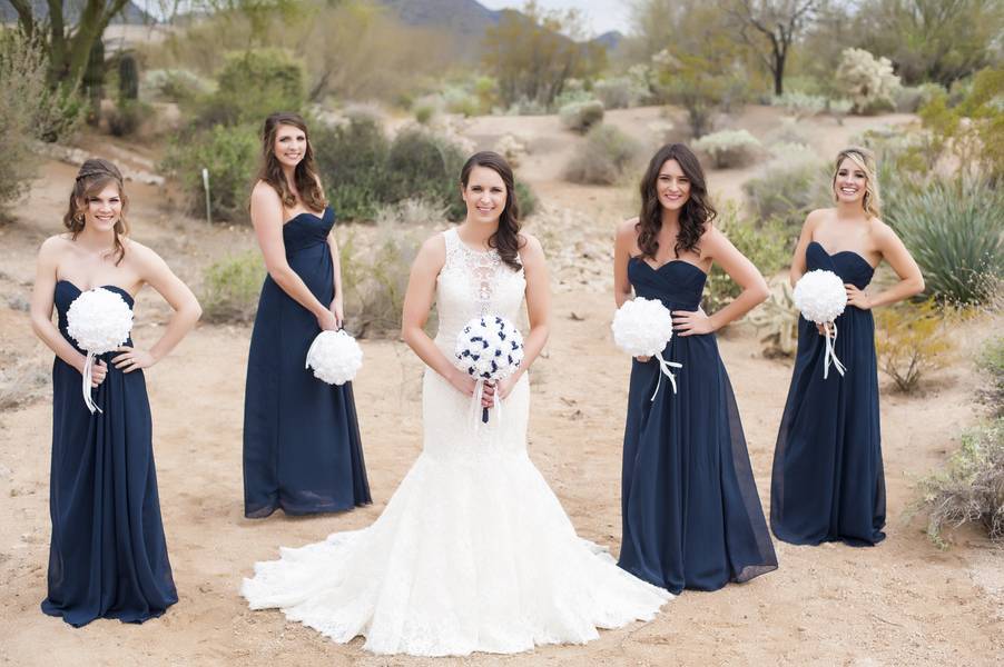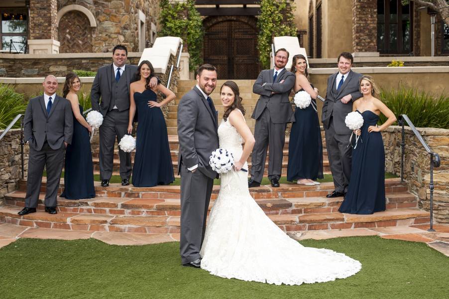 I wanted a clean, simple, and classic wedding look. The groomsmen wore matching charcoal gray tuxedos, and the bridesmaid wore matching chiffon, floor length navy blue dresses.