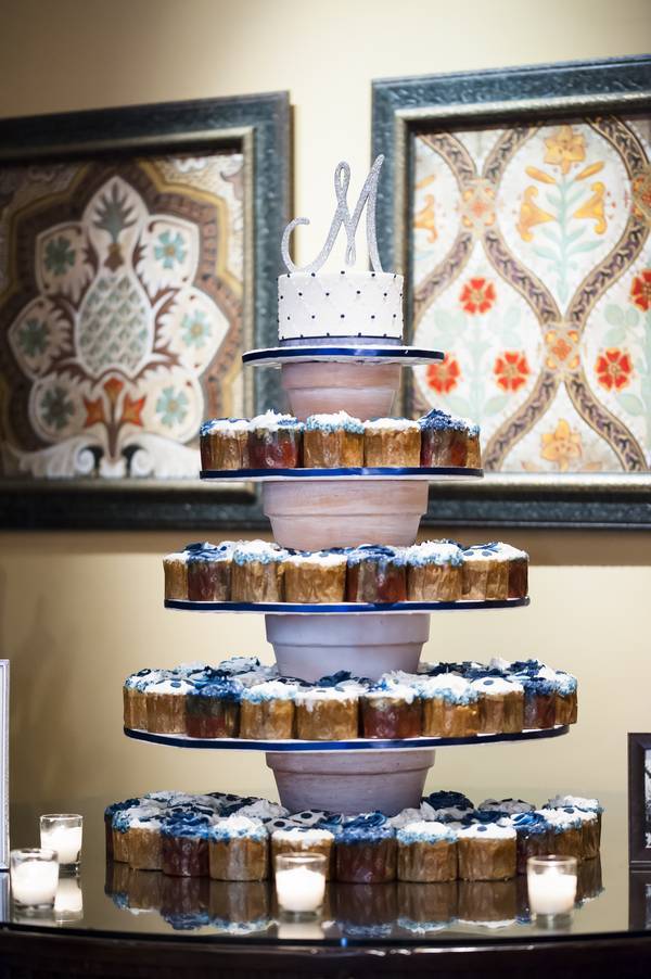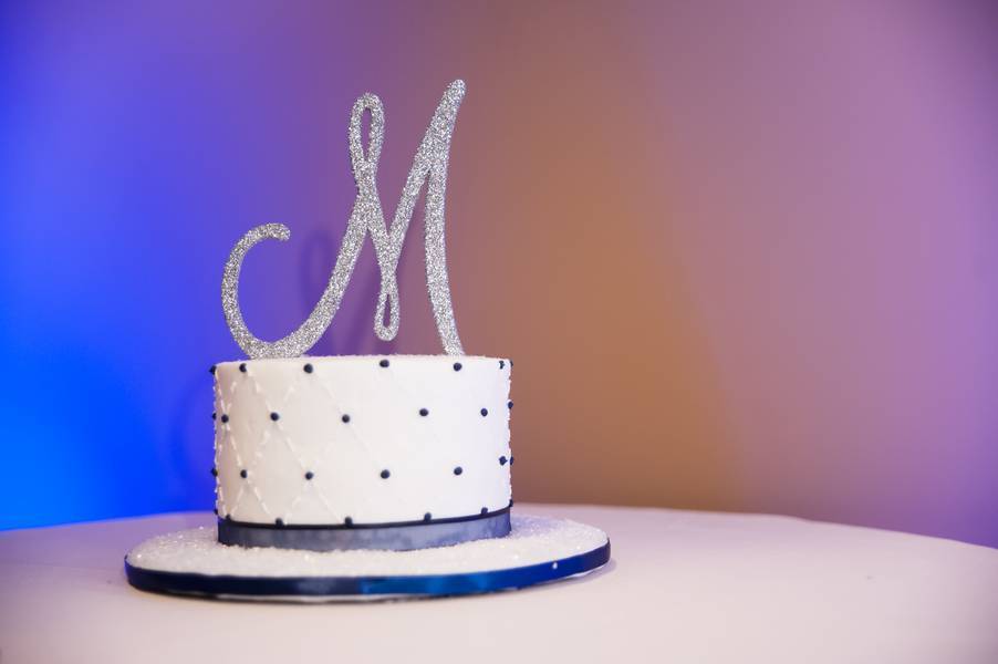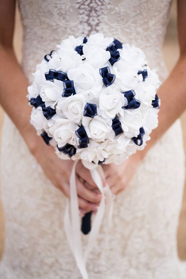 We had a few DIY projects. We made centerpieces for the cocktail hour that were small votives with wine corks glued to the outside and wrapped in navy blue ribbon. We also made a sign for the reception room fireplace that spelled out our last name and was decorated in navy, silver, and white embellishments. I also made the bridesmaids bouquets! I bought silk pomander balls (also known as kissing balls) and made “stems” for them so the girls could carry them down the aisle.