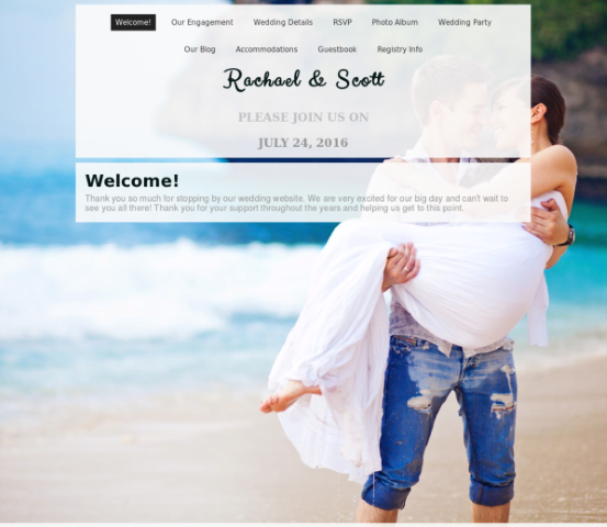 For brides who are modern and streamlined, this beautiful template allows them to display their favorite engagement photo as the background of the website. The font combines a playful black script showcasing the names as well as a standard gray text