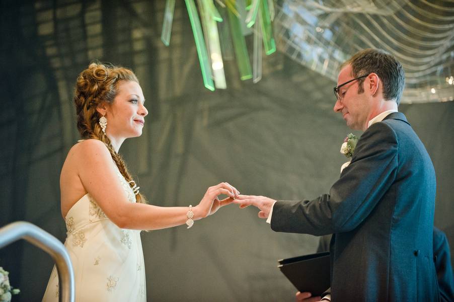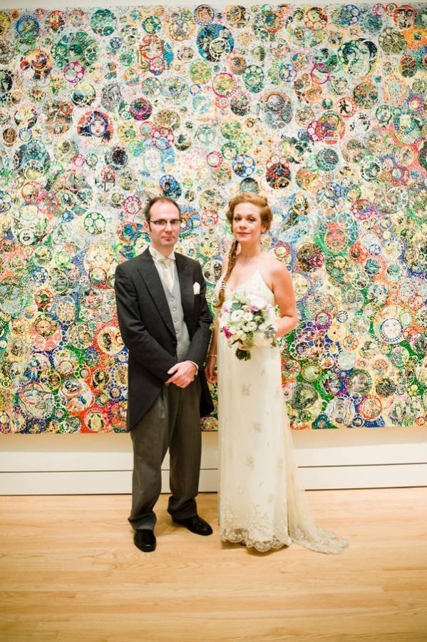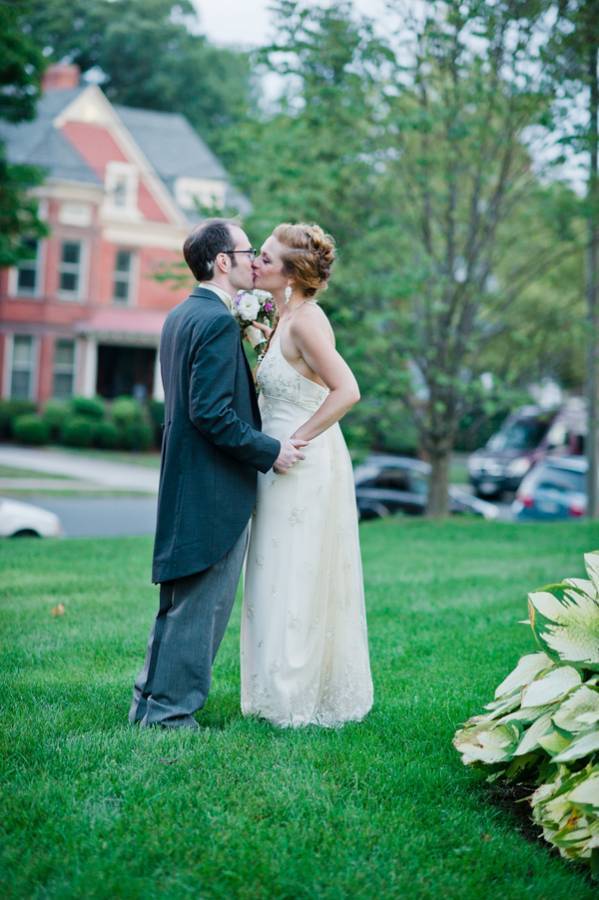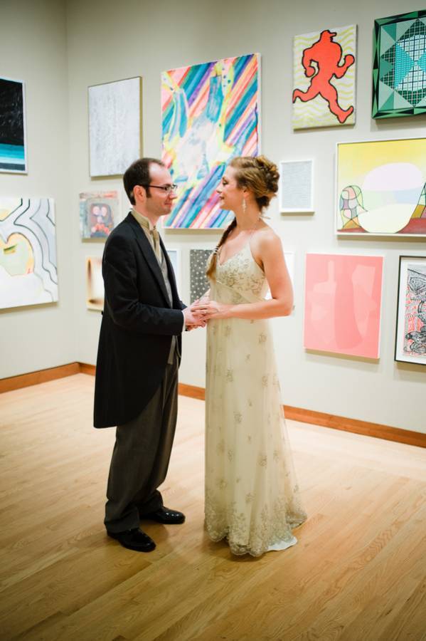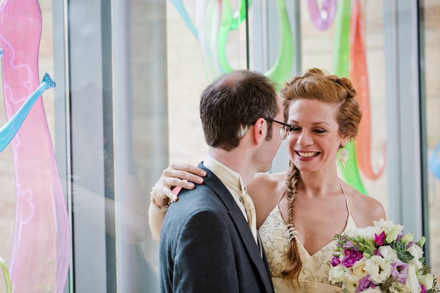 Kelly Jo and Thomas love art and keeping things local, so having their wedding at the New Britain Museum of American Art made perfect sense. She got ready in the museum library and they shared vows under a beautiful glass sculpture. Their first look was rained out, but it would have been in the same park where Thomas proposed to her. Cocktail hour was held in the galleries and they snuck away for portraits in the rest of the museum. The reception was catered by Riverhouse Catering, and featured both vegan and non-vegan fare. The natural floral centerpieces looked beautiful. Everything about the day was absolutely perfect.