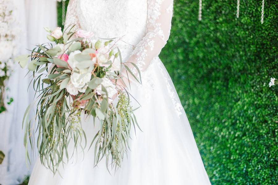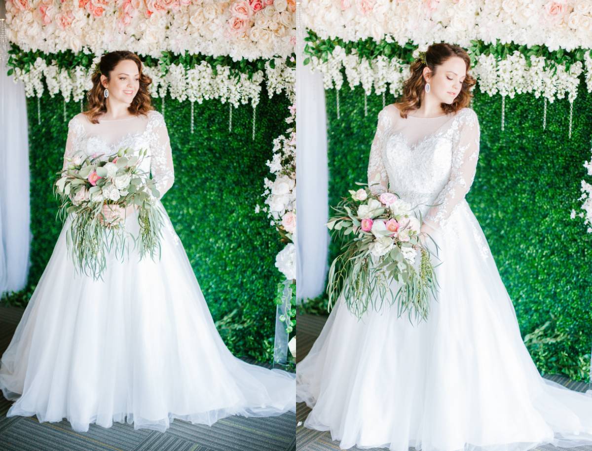 There are so many details that I love from this event, and a couple, in particular, stood out to me. The gorgeous floral backdrop was such a beautiful detail that literally light up the room. I also loved the table setting, especially the serveware (luxury stoneware dishes and pitchers). I love the colors, textures and the look of them that really made the room pop. I also love the white drapery, vintage chairs, and the bridal gown–everything was so beautiful!