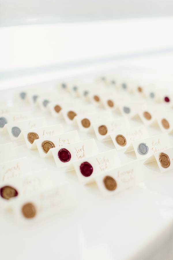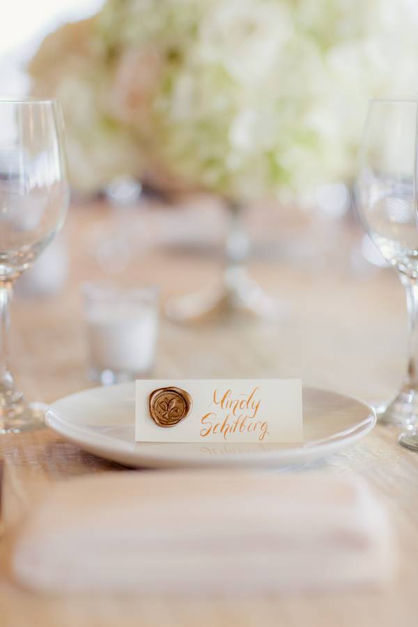 My mother is a big DIYer, so there were many customized touches. She designed the wedding invitations, which were letterpressed by a local artisan. The blackberry motif of the invitation was chosen from the design of the stage curtain at the local performing arts center, where I performed many shows during my youth. A local calligrapher addressed all of the invitations and made the place cards. A custom wax seal was made to seal all of the invitations. Wax seals were also used on the place cards to identify which meals were ordered. Welcome bags were filled with handmade bath and body products (all made by my mother!), including a soy wax candle, soap, lip balm and herbal bathtub tea. Custom labels were made for each item using our photographer’s