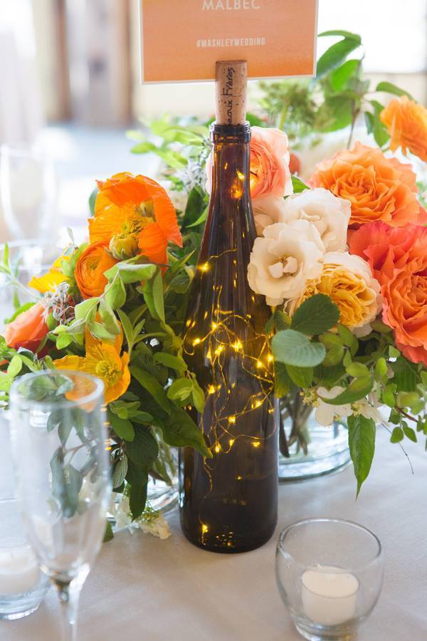 THIS CENTERPIECE! Wine bottle because, duh, vineyard, and the fairy lights inside to add a touch of whimsy. LOVE!