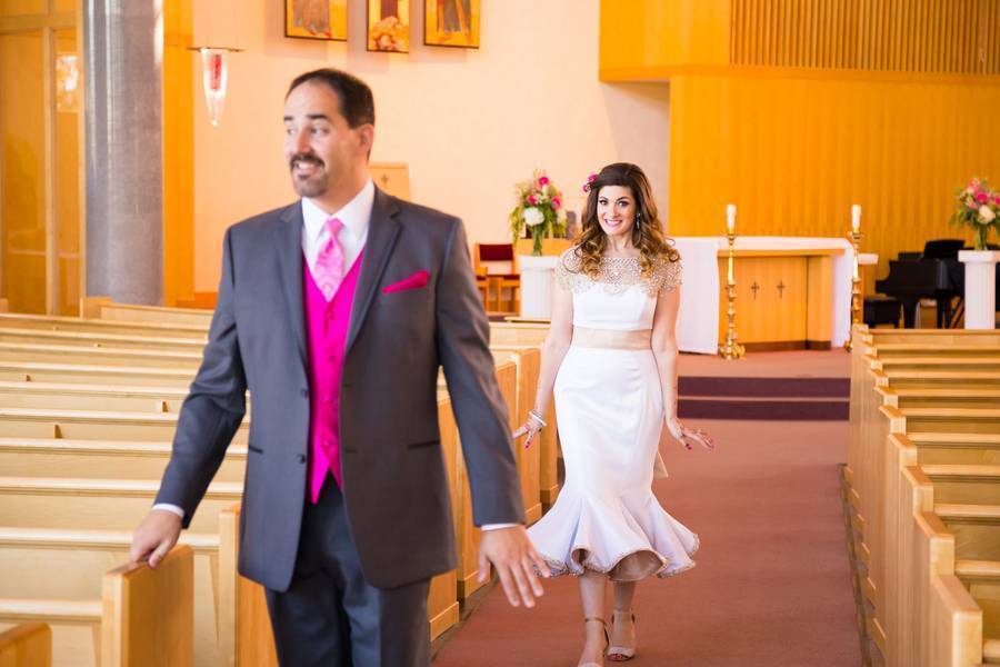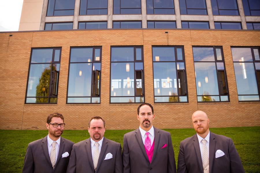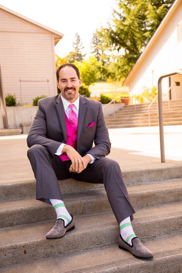 The men had it very simple – Men’s Wearhouse Tuxedos. Of course, Jeff had to spice it up with Versace underwear and crazy socks. Oh and his shoes! Jeff loves shoes, so wandering through the aisles at Nordstrom Rack can be very troublesome when you come across black satin loafers covered in silver rhinestones, especially when they are half a size too small! But Jeff being a tough man, decided, “Women wear uncomfortable shoes every day for fashion,” and bought them anyway to wear at the wedding.