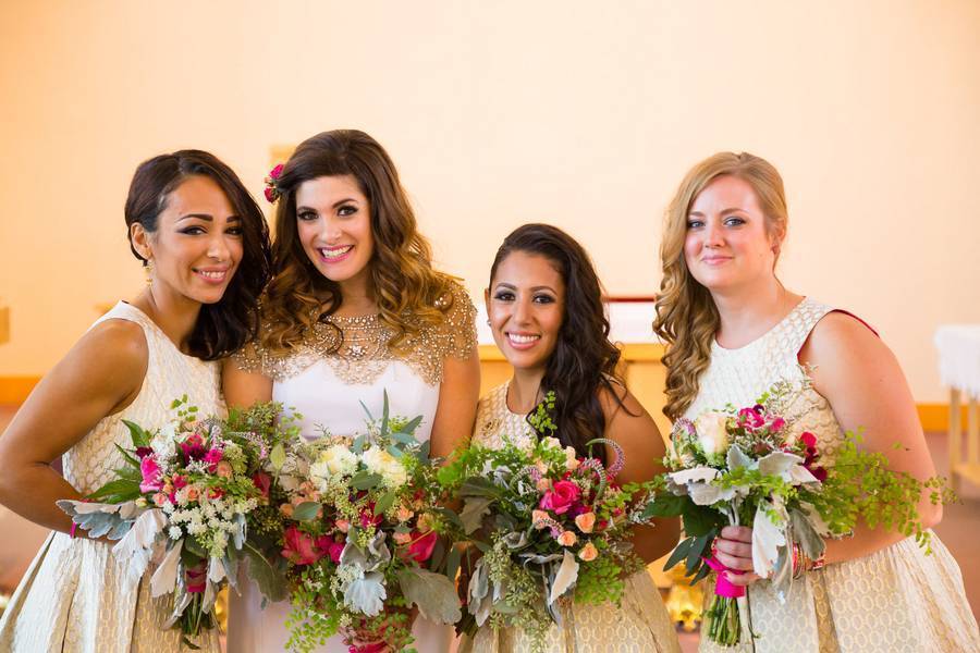The bridal party found their dresses at Nordstrom, who was great to work with because they offered free alterations for card holders and also were able to get the dress in both petite and regular sizes. Plus, Nordstrom points! The worst part for the bridal party was finding pink shoes in the fall. The wedding dress was a collaboration between Gizzelle and Norbert Teston with an Art Deco twist. Making a custom dress was one of the highlights of the event.