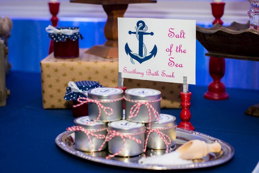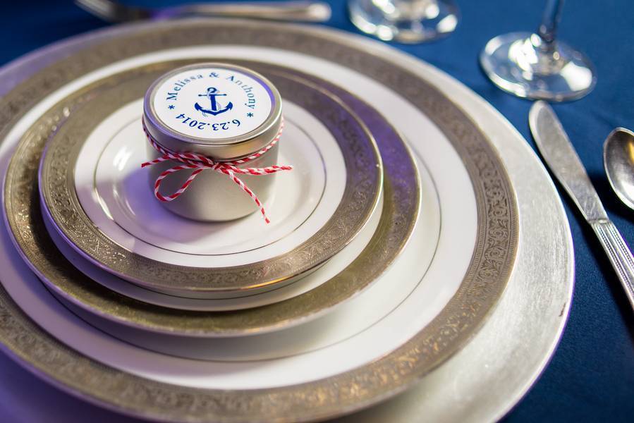 LB Floral created a red, white, and blue masterpiece within a silver urn and pulled in nautical details with striped handle on the matching bouquet. The nautical theme continued on the wedding stationary from Star Noir Studio and scented bath salt favors from Custom Love Gifts & Events.