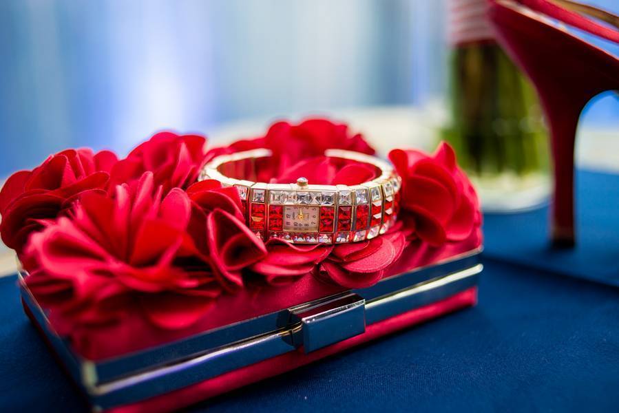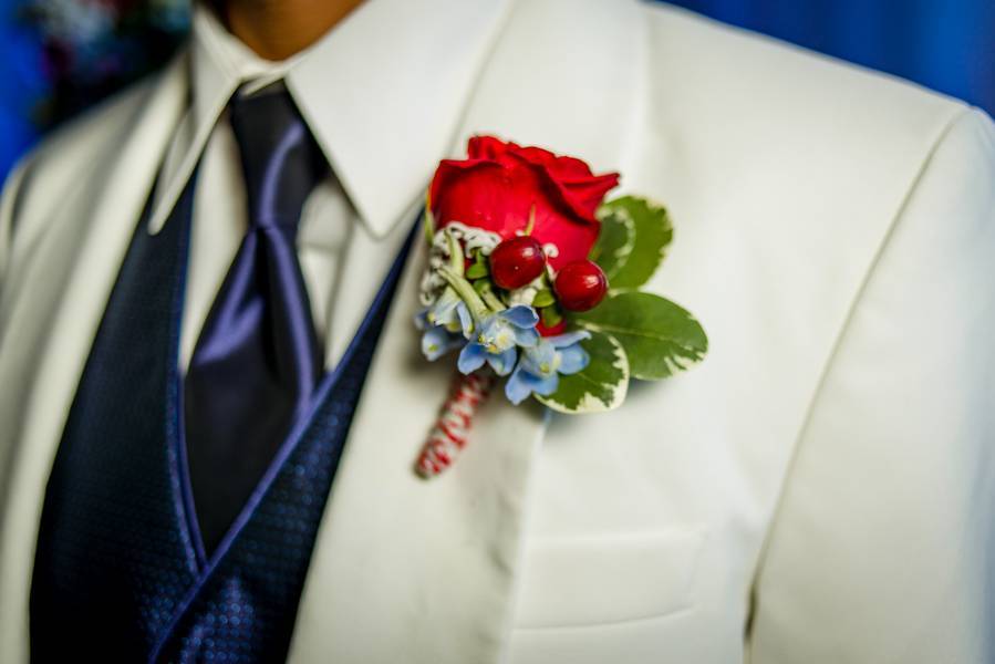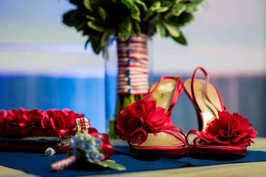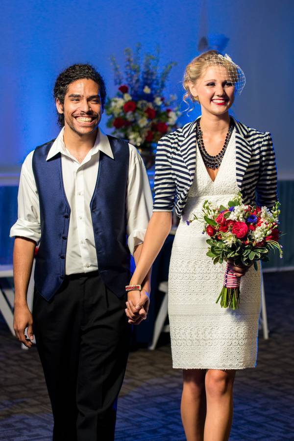 Savvi Formalwear created a captain inspired tuxedo ensemble with a white coat and navy vest and tie that went perfectly with the bride’s navy and white striped borello jacket. Wedding Wonderland’s simple white croqueted lace dress had a matching shorter version that was the perfect getaway dress paired with a birdcage veil. Southern Belle Beauty highlighted the brides lips with the perfect red shade to match her shoes, purse, and ruby and diamond bracelet.