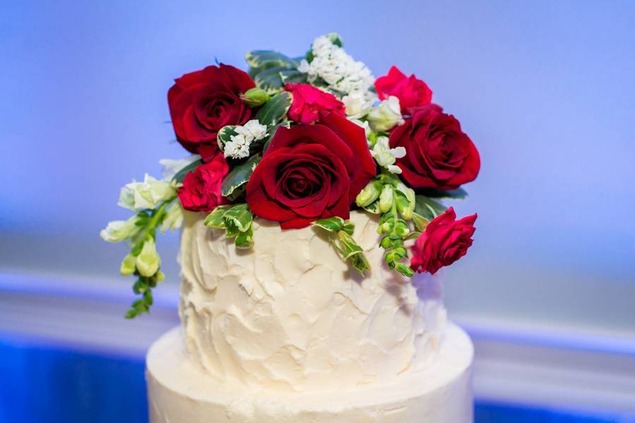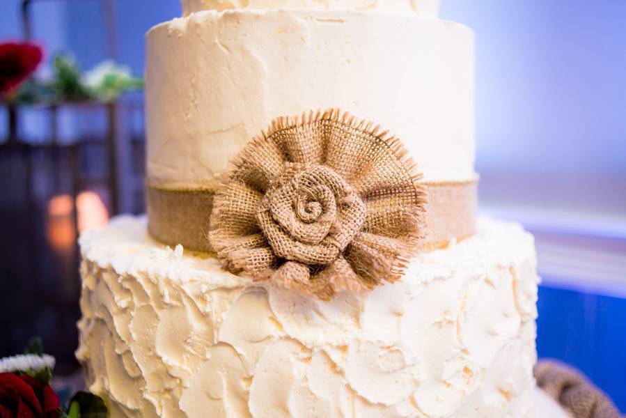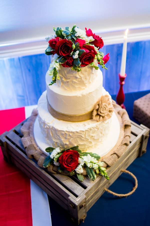 Event Rentals by Rothchild provided gorgeous silver rimmed China, nautical themed lanterns and unique rosette knot chair sashes. Red roses and a drift wood toned wooden crate cake stand were the perfect details for a buttercream iced cake from Sweet Beginnings by Elaine.