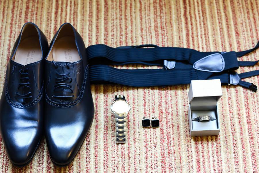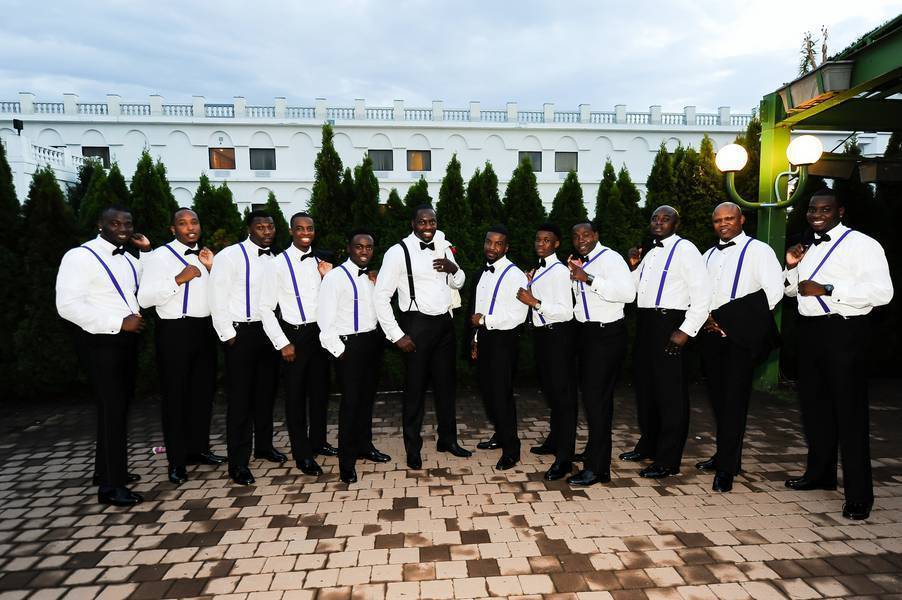 The Wedding day outfits were inspired by our royal color palette (Red and Purple) We worked together with our Planner to come up with the overall classic look of the bridal party. Our Bridesmaids wore Purple Chiffon One Strapped Dresses with my Maid of Honors wearing Red Chiffon One Strapped Dresses. Our Groomsmen were in Classic Black Tuxedos w/ purple suspenders for a pop of color. My dress was a mermaid embellished with swarovski crystals that I absolutely loved! My groom wore a Ivory Tuxedo Jacket for the ceremony and a Black Tuxedo Jacket for the reception.