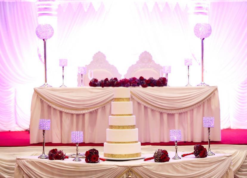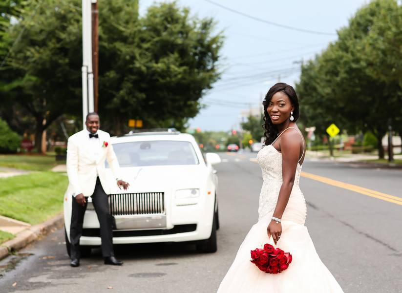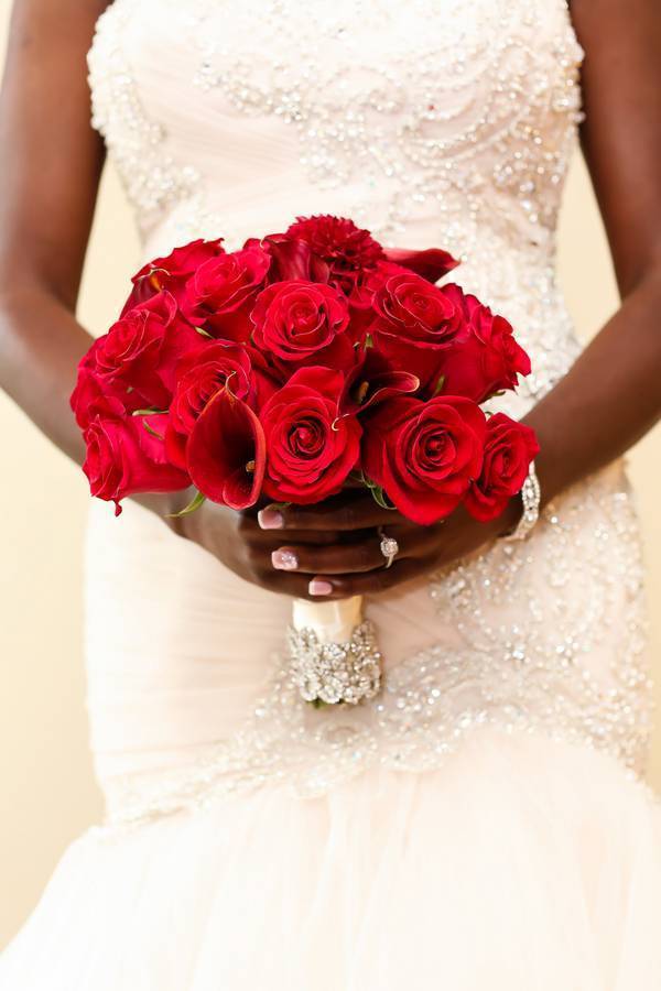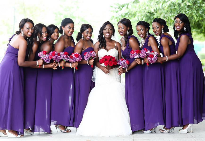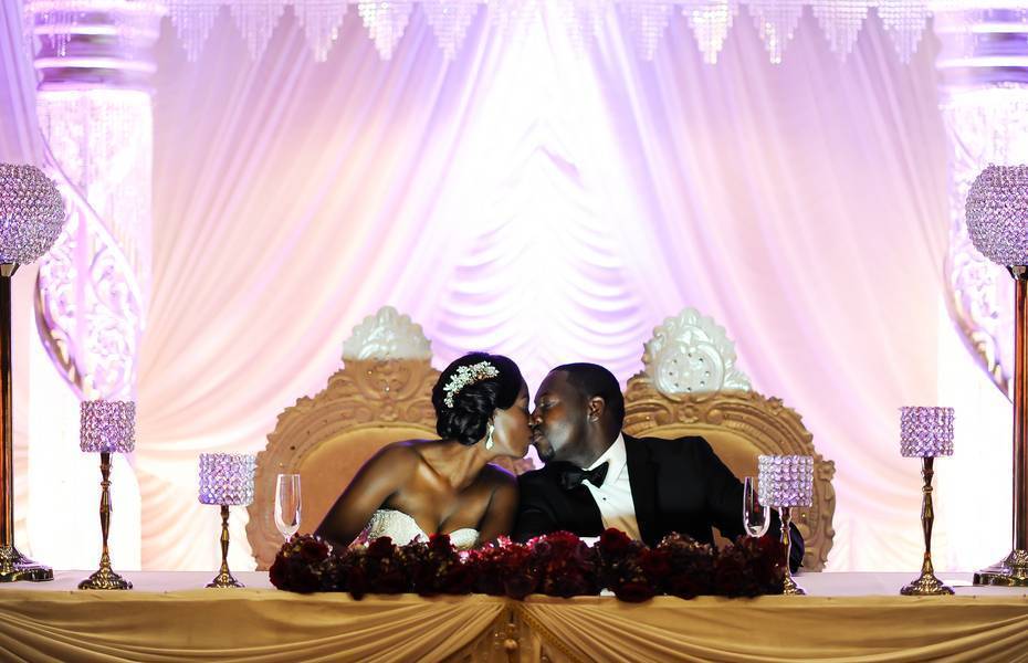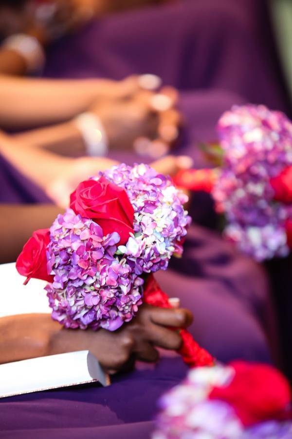 We knew we wanted big Royal wedding so the perfect place to have it would be a Palace. We worked with our planner, Emma Pierre-Louis of Prestige Affairs Events, to coordinate all the logistics from the color palette consisting of royal purples and rich reds, which were seen throughout the flowers (roses and hydrangeas) and bridal party attire (red and purple chiffon one strap dresses) to our décor with ornate touches (our head table with Royal Seating, an Elaborate backdrop, and Crystal Candelabras ) to resemble the decor of the Palace.