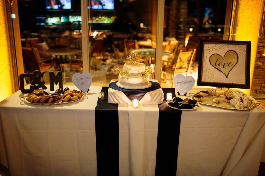 Reception: Donuts and Pizza! In addition to a cake, we decided to have donuts too which were a huge hit! And we had Pizza delivered during the “NYE” portion of our reception that was just what everyone needed to keep them going to the ring in the new year.
