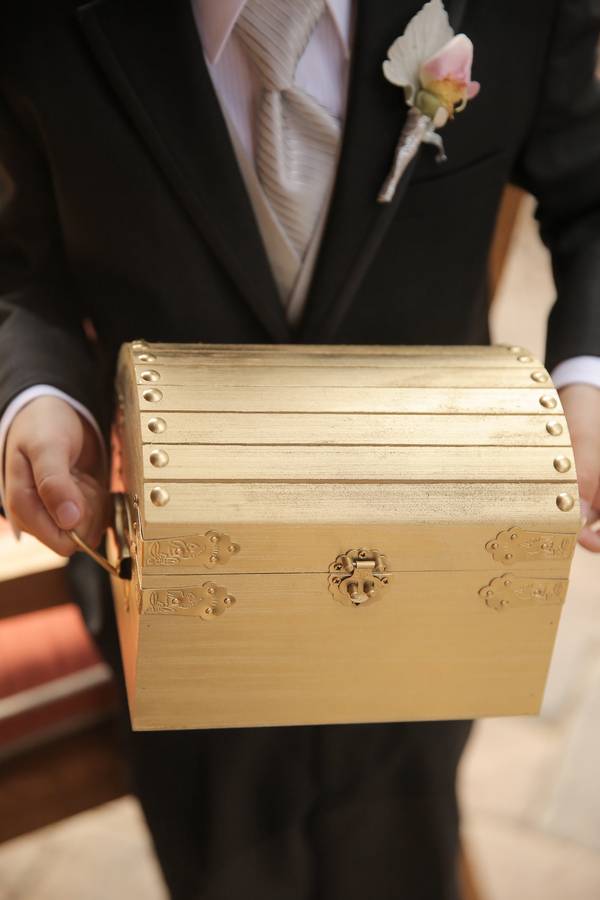 The DIYs. The DIYs were the table numbers; designed in picture frames with artistic paper to accentuate the theme and bring additional depth. Numbers were painted wood or crystal adhesive. Escort cards; Champagne gold matching the save the date and invitations with each guest’s table number and menu choice. Flower Basket; Made by Laurin and her Mother. Ivory satin lining and ribbon with tulle skirt and jeweled accent bows. Made to match the flower girls dress. Treasure box; Painted gold wooden treasure chest. Fans; Silk and bamboo fans with custom ribbon with names and date of the wedding. Card Bird Cage; Decorated with ribbon and jewels to give it a little sparkle.