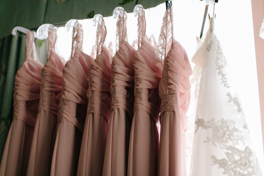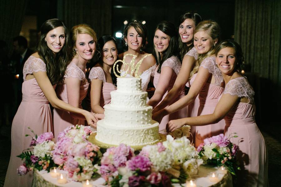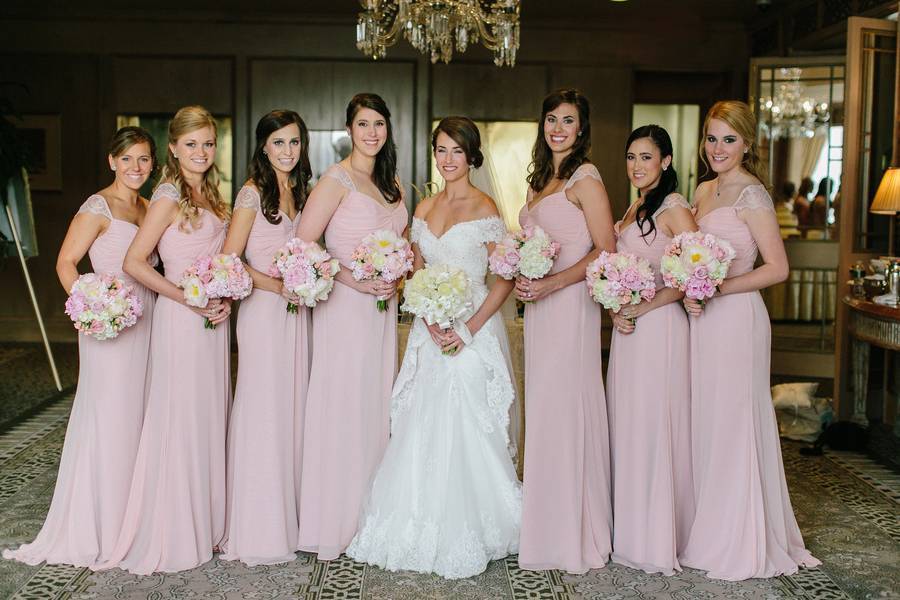 Very Classic and Chic Attire. Lace covered off the shoulder Jim Hjelm designed gown. Groom’s charcoal grey suit and blush pink bridesmaid gowns.