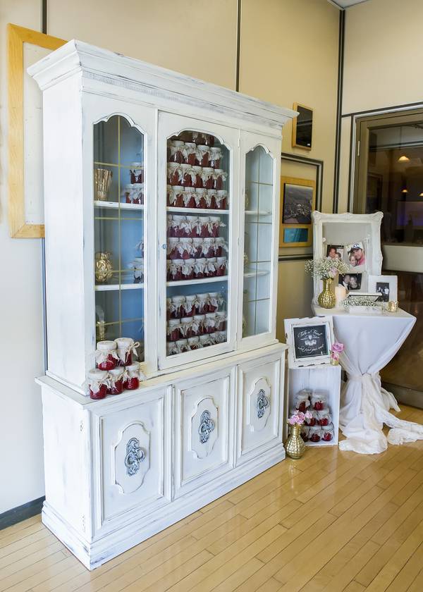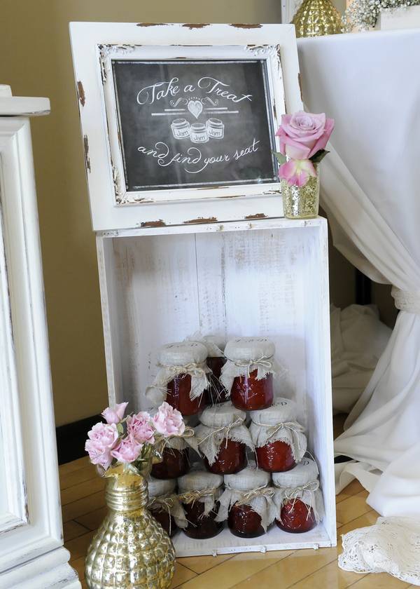 The favors. Strawberry jam in personalized mason jars with their initials stamped on them.