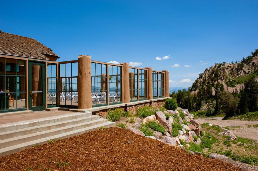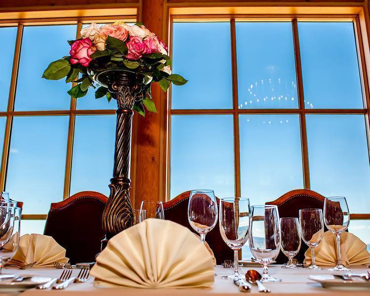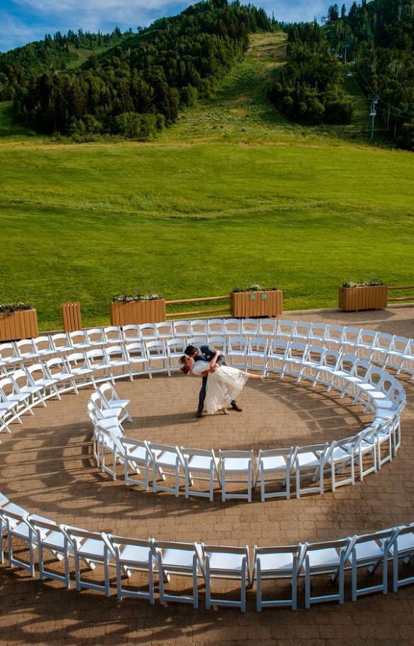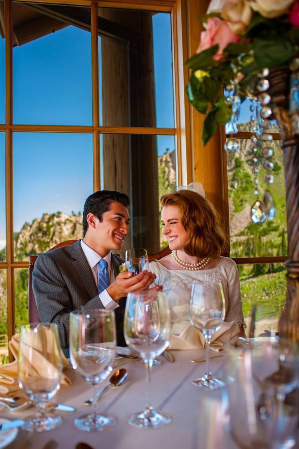 Our couple started with a ride in a tricked out gondola car to the Needles Lodge. Complete with leather seats, sound system, tinted windows and a mini bar. Snowbasin knows how to treat the man and woman of the hour. We showcased the amazing patio view at the Needles Lodge for the ceremony. Imagine attending a wedding ceremony that overlooks mountain tops from your seat on the open-air patio. After the ceremony, the lodge is set up for a seated meal and yes, you are still on top of the world with views to die for. After freshening up in Snowbasin’s award winning restrooms, we rode the gondola down to Earl’s Lodge for some socializing and danced under the red Murano crystal chandelier. The “Grace” dress is convertible and gives multiple looks for the bride to choose from. The suit is a summerweight gray wool custom suit.