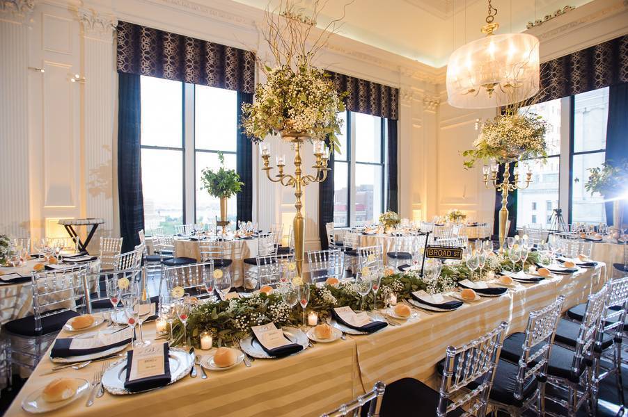 The theme carried through to the reception venue. Two long tables flanked the entire length of the dance floor and had a runner of greenery and flowers from one end to the other. Tall candelabras with cascading garden flowers lined these tables. All other décor was kept simple. In the cocktail room, we framed wedding photos of our parents and grandparents. Our stationary was purchased at The Paper Unicorn in Doylestown, PA. Gold letterpress and edging were highlighted on soft, heavy paper. Envelopes were sealed with gold wax and a custom stamp, addressed in gold calligraphy, and mailed out of the oldest Post Office in Philadelphia where they were hand stamped with Ben Franklin’s signature.