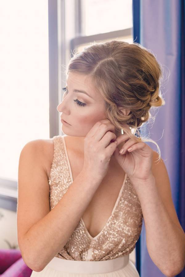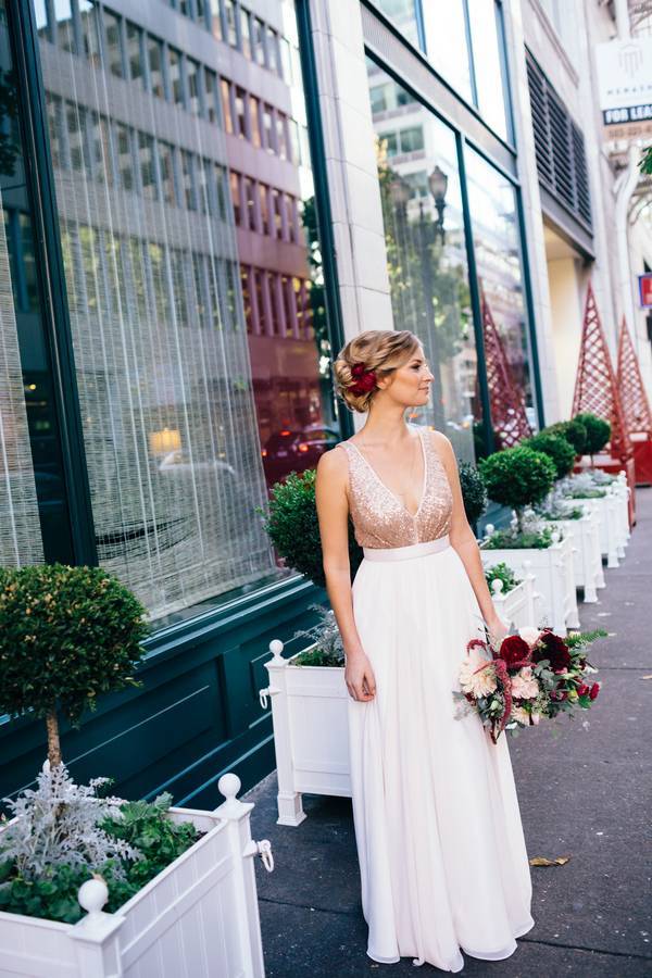 The bridal style. Katie was a stunner in her white and gold chiffon floor length dress. She also had her hair up and accentuated a red flower. It was a great idea having her hair up to show her bare back. Talk about sultry and romantic!
