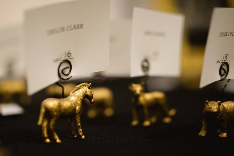DIY Pleasures: I designed and printed all of the stationery for our wedding, including save the dates, invitations, and some signage. I also made all of the place cards for the reception. They were tiny toy animals I spray painted gold with the name card inserted in the top. The sign on the table said, “find your party animal”.