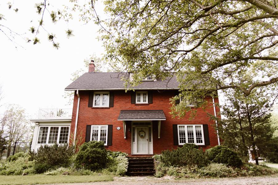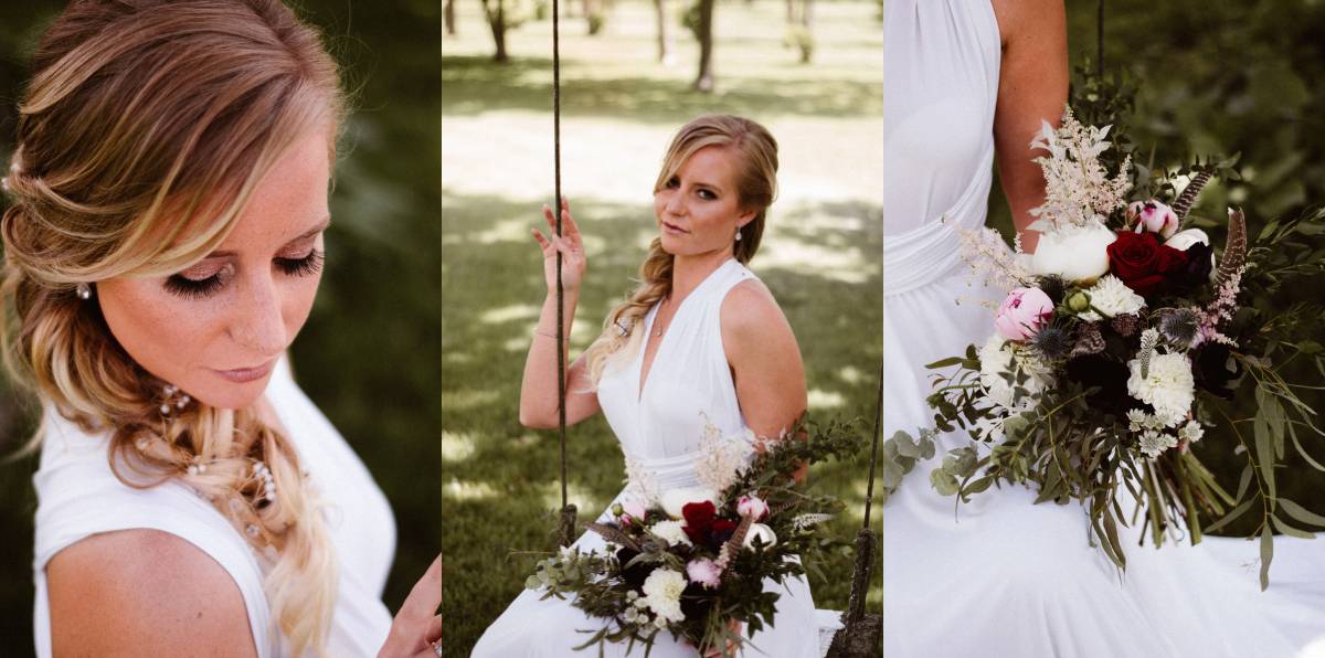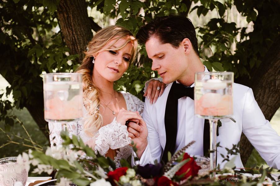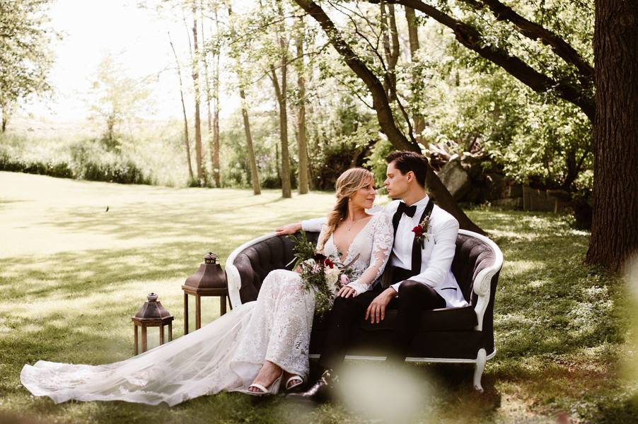 Cailey and Brendan originally held their dream wedding ceremony in the mountainous Sonoran Desert of cacti filled, Tucson, Arizona. When their videographers asked the striking pair if they’d like to model for an elopement themed styled shoot back home in Ontario, Canada, the couple readily agreed. They even offered the use of Brendan’s father’s sprawling, 3-acre, creek-lined homestead in Stoney Creek as a setting. Numerous trees punctuate the grounds of the large colonial style home as well as a rustic, wooden swing. The barn style garage houses a collection of vintage cars, including a 1988 Pontiac Fiero and a 1929 Ford Model A as depicted in the photos.