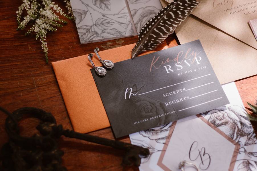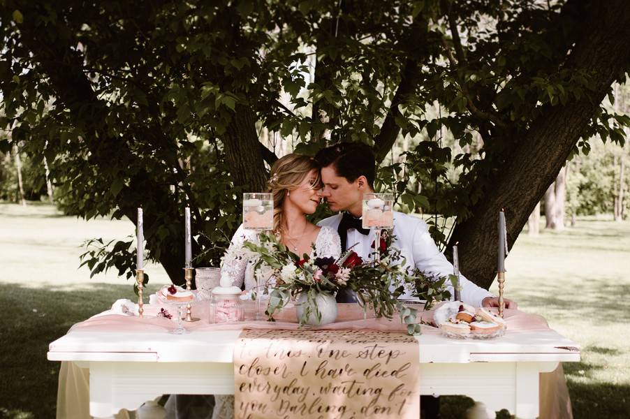 Calligraphy was delightfully prominent in this shoot. In addition to the tablescape creations and wood signs, Jaye Designs scribe inscribed “Love Struck” onto the back of a leather jacket worn by Cailey. Another fabric quote which read: “And so the adventure begins” was fastened to a copper arch. The stunning invitation suite was infused with shades of copper, gold, blush and black, depicting beautiful country roses and a map.