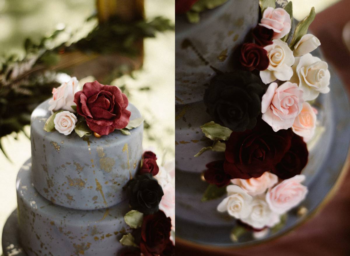 Exquisite donuts and mini cream puffs with a gold harlequin pattern and miniature roses were made by Occassions Treats Parlour. With an antique gold frame looming above, their three-layer, marbled and moody-hued cake with flawless flowers was fit for royalty, topping a charming antique sewing table with florals spilling from wooden drawers.