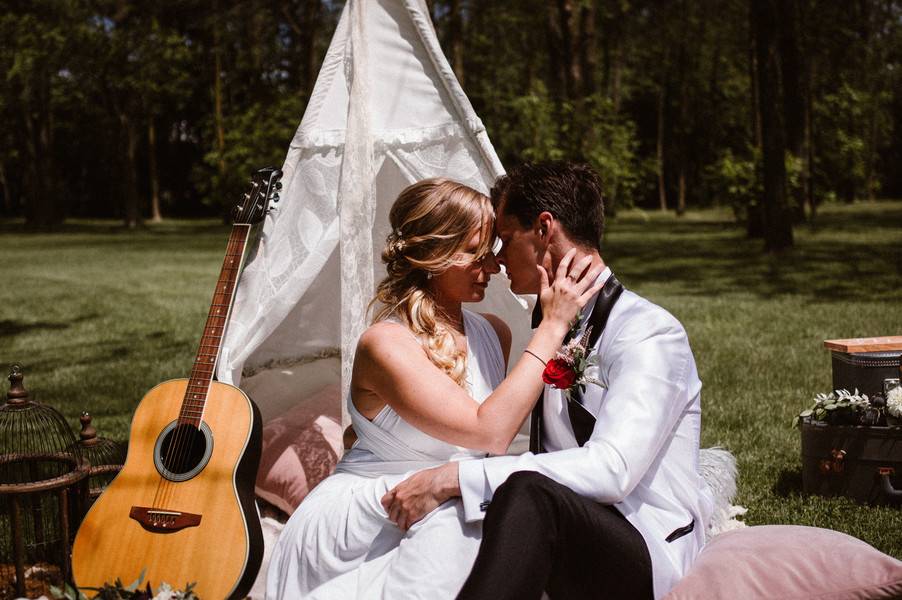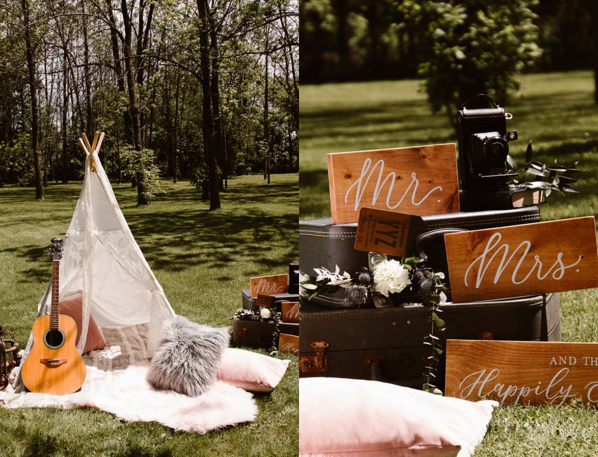 The beautiful cabinet turned sweet table was one of many wonderful vintage and antique items sourced from Joani Wedding Rentals. Their copper arch crowned with florals in front of the stream served as a gorgeous backdrop for the ceremony. A charcoal tufted settee provided lush seating, and an ornate white desk served as a registry table. A romantic teepee tent with vintage accessories, cozy textiles, rustic wood signs depicting “Mr”, “Mrs”, and “Happily Ever After” created the perfect setting for a cuddle and some strumming on the acoustic guitar.