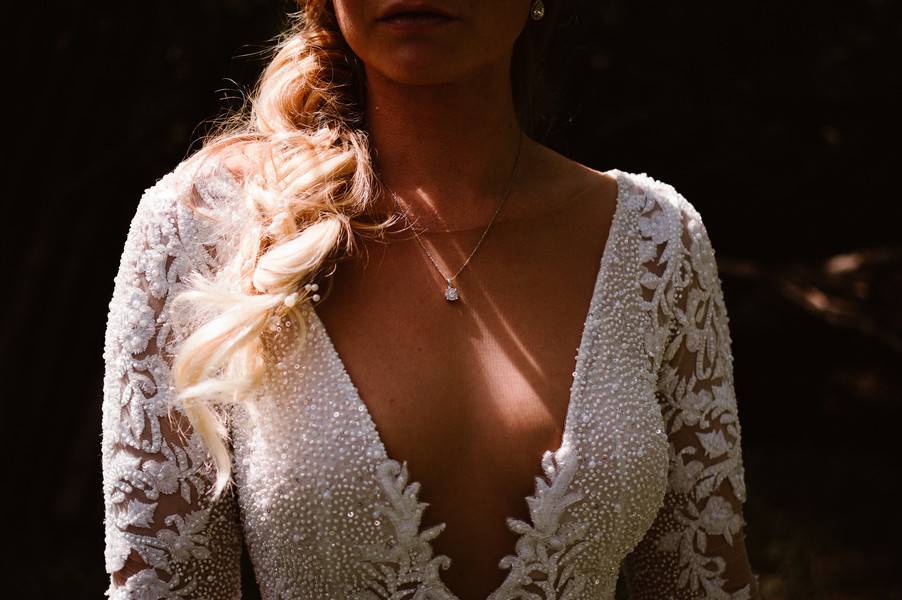 Makeup by Lubu was flawless with warm cocao shades and rose gold glitter accentuating Cailey’s eyes, and shimmery pink lips with a dash of gold. She also created a romantic and beautiful side swept braid in Cailey’s hair, interwoven with a delicate hair vine embellished with pearls and crystal from Blush Bridal.