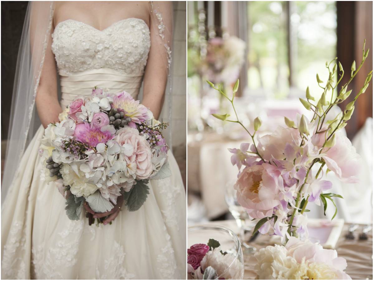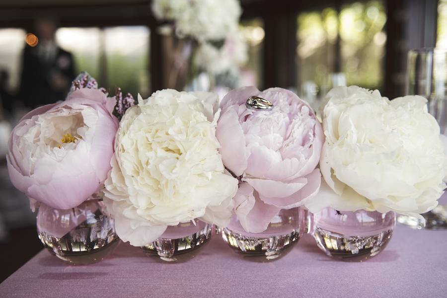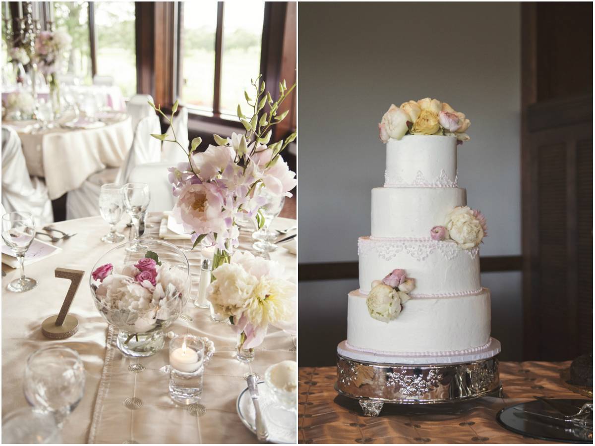 Hannah’s flowers were gorgeous with peonies that were flown in directly from Alaska. And since it is from a far away land, it has to appear in every corner of the venue — bouquets, cake, and centerpieces in vases!